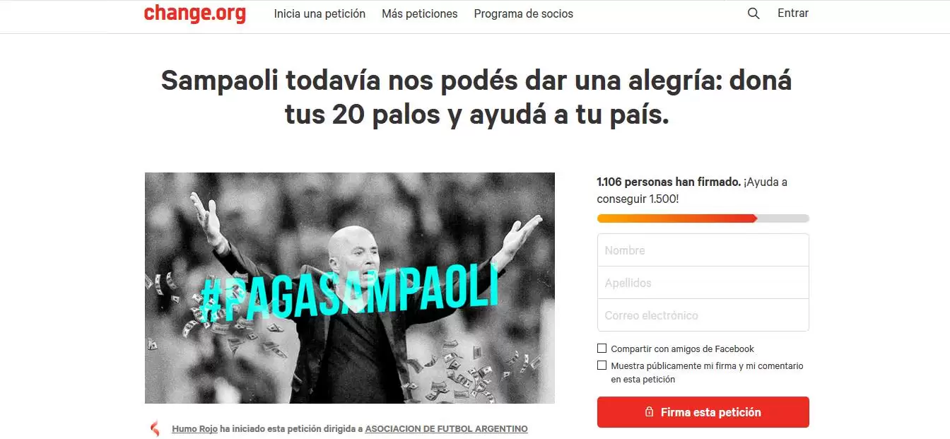 “PagaSampaoli” fue el hashtag lanzado a través de las redes sociales por la agencia Humo Rojo, que creó una petición a través del sitio web Change.org y ya sumó bastantes firmas.