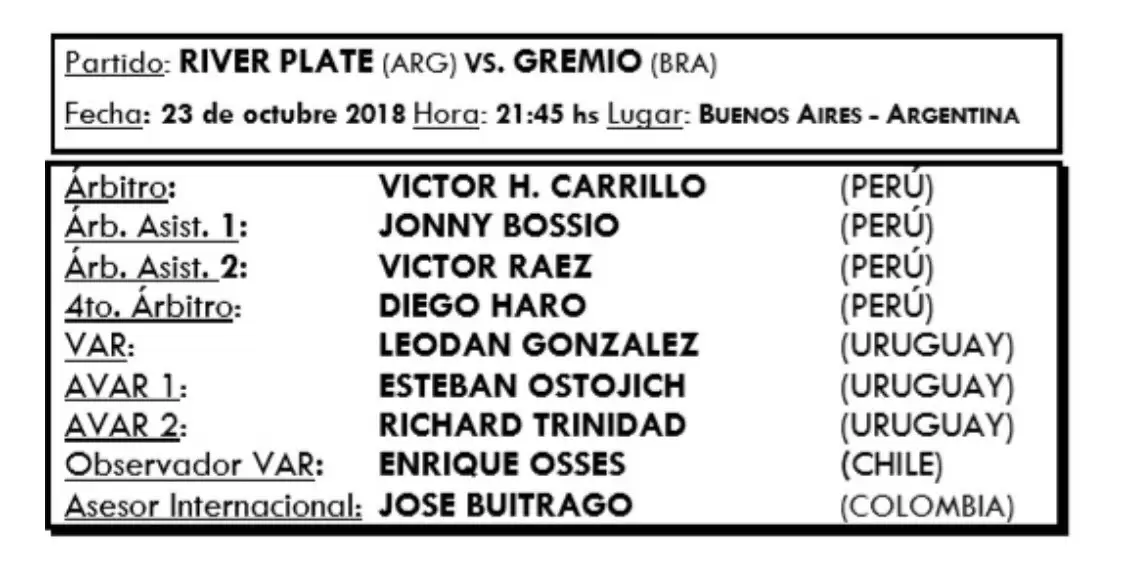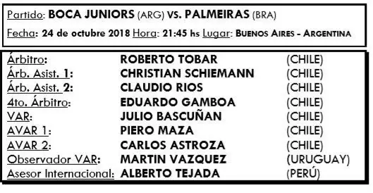 En el caso de River y su encuentro frente al Tricolor portoalegrense, será el peruano Víctor Hugo Carrillo acompañado por jueces de línea de su país y terna uruguaya en el VAR, mientras que para el partido de Boca frente al Pameiras la terna y VAR será chilena con Roberto Tobar al frente.