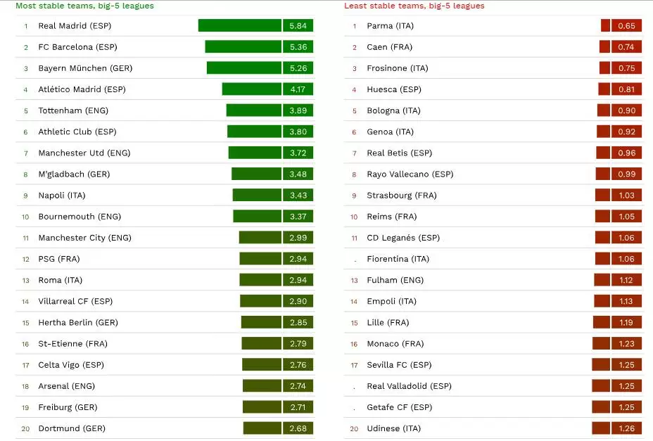 Queda comprobado que los equipos con mayor promedio son los equipos más competitivos en sus respectivas ligas, lo contrario para los clubes menos estables. Además, los niveles de estabilidad más bajos se registraron en el club croata Istra (0,15 años) entre las 31 ligas competitivas de Europa y por el lado de Italia, una de las cinco ligas más fuertes, es el Parma con un promedio de 0,65 años.