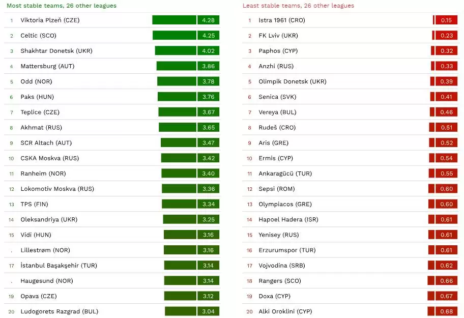 Queda comprobado que los equipos con mayor promedio son los equipos más competitivos en sus respectivas ligas, lo contrario para los clubes menos estables. Además, los niveles de estabilidad más bajos se registraron en el club croata Istra (0,15 años) entre las 31 ligas competitivas de Europa y por el lado de Italia, una de las cinco ligas más fuertes, es el Parma con un promedio de 0,65 años.