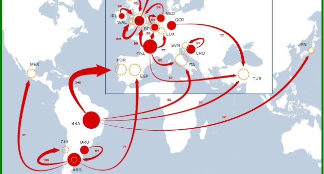 Con Brasil, Francia y Argentina en la cima del podio, el estudio contabiliza un total de 1236, 821 y 760 futbolistas exportados respectivamente, siendo Portugal, Inglaterra y Chile los destinos preferenciales en cada uno de los casos correspondientes.