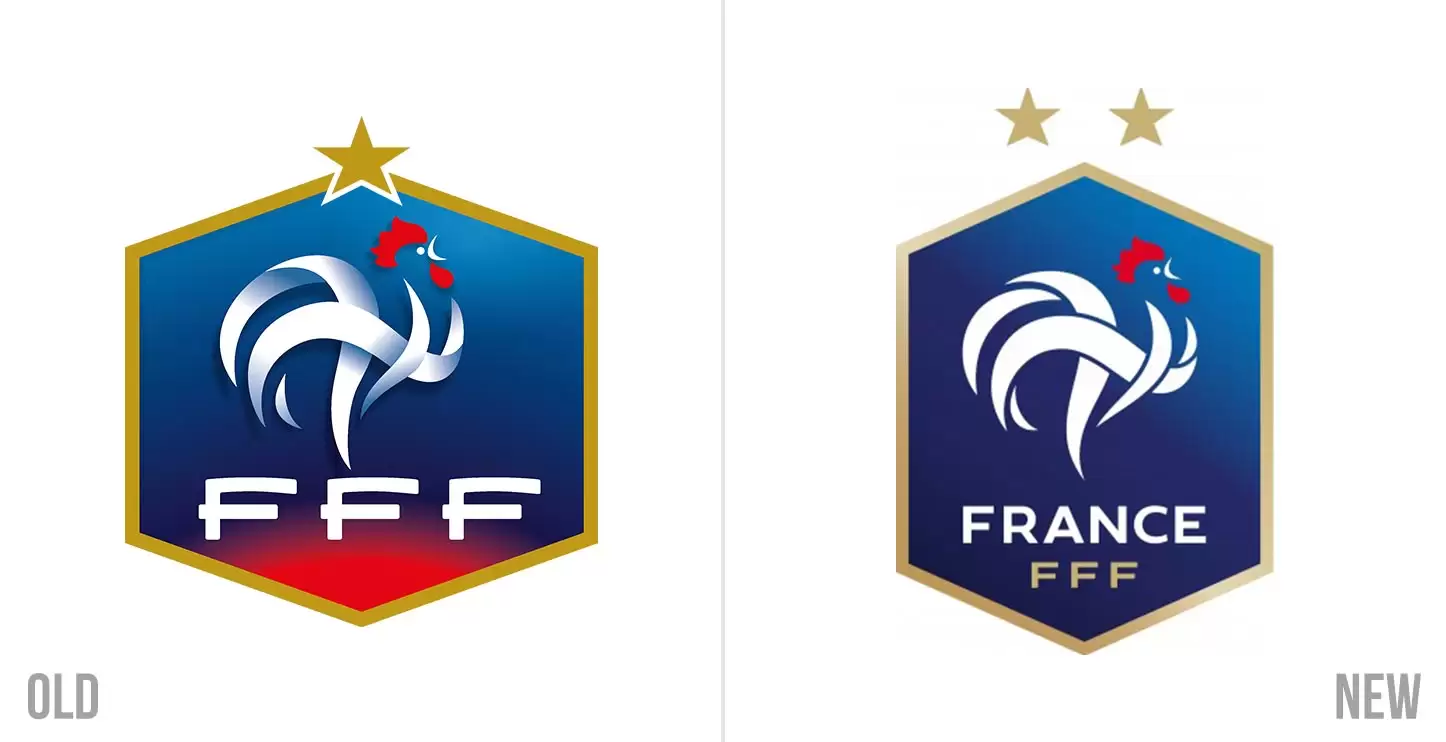 En cuanto al nuevo emblema del equipo nacional que hoy dirige Didier Deschamps, se ajustó de manera más vertical el hexágono que le da forma a la insignia mientras que la gama de colores tomó mayor sobriedad al mismo tiempo que incorporó ya las dos estrellas (1998 y 2018).