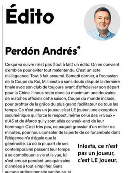 “Lo que sigue no es un editorial. Lo dejamos claro desde el principio para evitar cualquier malentendido. Es un acto de lealtad. Absolutamente asumido. El sábado pasado, con motivo de la Copa del Rey, el Sr. Iniesta sin duda jugó la última final con su club siempre antes de formalizar su partida a China. Todavía tenemos un máximo de una docena de partidos oficiales esta temporada, incluida la Copa del Mundo, para disfrutar de la gracia del mejor facilitador de todos los tiempos. No es un jugador, es EL jugador, una excepción ecuménica que merece el respeto, incluso la de los rivales como As y Marca que fueron participes este fin de semana de su homenaje. Es muy poco, este áspero paquete de mil minutos, para consolarnos por la pérdida de este funambulista, cuya elegancia solo se ve igualada por la generosidad. El lugar donde la mayoría de sus contemporáneos pasan el tiempo complicando la vida y la vista, él se divirtió durante quince años para simplificar todo. Sin ninguna arrogancia engreída y como un hedonista atento, para hacer disfrutar del buen juego. Sin él, Messi probablemente se habría cansado del Barça antes. Con él, el Barça ha destruido todas las adversidades posibles. Intuitivo, hábil e iconoclasta, el Sr. Iniesta ha demostrado que el cerebro es sin duda el músculo esencial de los campeones fuera de serie. Su talento es inventar. Un altruismo forzoso que ciertamente lo ha privado de un reconocimiento aún más majestuoso. Como es el Balón de Oro, que se le escapó en 2010 (segundo) y en 2012 (tercero). Entre las grandes ausencias en el palmarés del Balón de Oro, la de él es dolorosa. A menos que una gran actuación en Rusia le permita reparar esta anomalía democrática”.