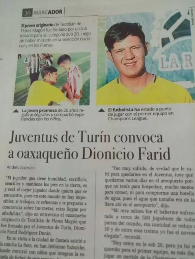 Originario de Teotitlán de Flores Magón, Dionicio Farid Rodríguez es un farsante de 19 años que se hizo pasar por jugador juvenil de la Juventus de Turin y así logró brindar cientos de charlas, entrevistas y clínicas deportivas por todo México.