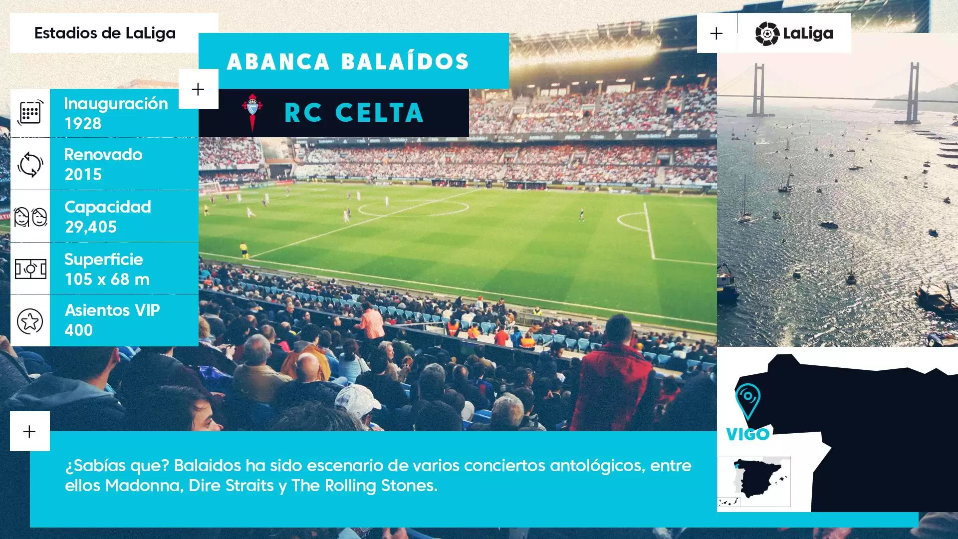En el mismo ‘fin del mundo’, como era considerada la costa gallega hasta el descubrimiento de América, entre el azul del cielo y el verde de los bosques, y a menos de dos kilómetros del océano Atlántico; se alza sobre el río Lagares el estadio de Abanca-Balaídos como si se tratara de un gran buque intentando alcanzar el mar.