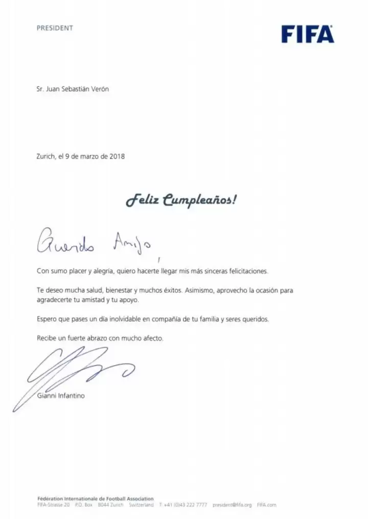 Una carta llegó a su despacho procedente de Zurich, desde el cuartel general de la FIFA. En el sobre una carta lo felicitaba por su cumpleaños. “Te deseo mucha salud, bienestar y muchos éxitos. Asimismo, aprovecho la ocasión para agradecerte tu amistad y apoyo” se puede leer en uno de los párrafos. Gianni Infantino, presidente de la FIFA, firma abajo a la derecha.