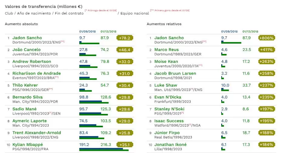 Esto se puede demostrar en un estudio realizado por el CIES Football Observatory en el cual se demuestra cuánto ha crecido en los últimos tres meses un jugador en cuanto al aumento absoluto y el aumento relativo de su valor de transferencia.