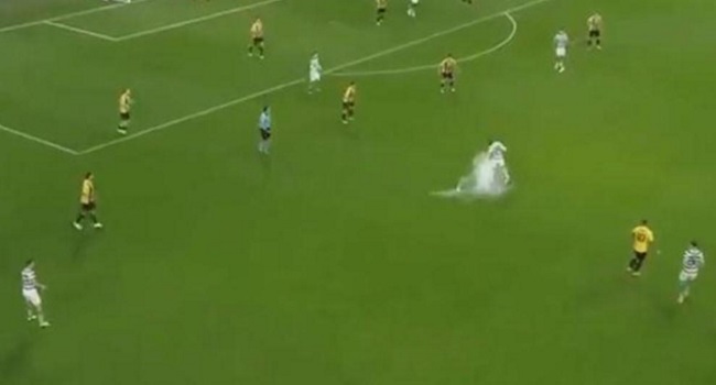 El árbitro, que usualmente lleva el aerosol atado a su cintura, sufrió la caída del spray en plena jugada de ataque del equipo local sin darse cuenta. El encuentro transcurrió normalmente hasta que de repente del prolijo césped de Celtic Park una nube blanca comenzó a hacerse notar.