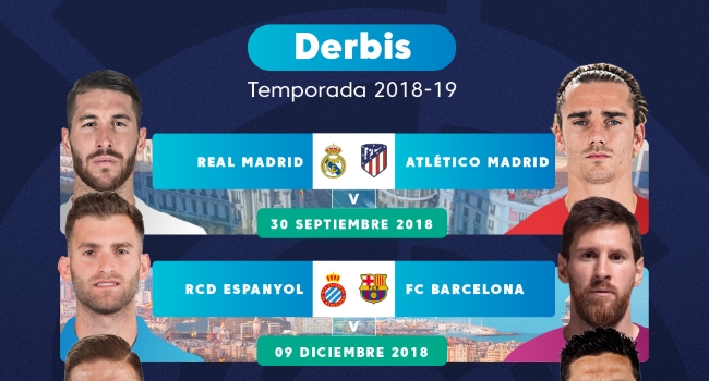Cada año LaLiga ofrece una multitud de derbis emocionantes y este año no es una excepción. Tanto el derbi sevillano (R. Betis vs Sevilla FC) como el valenciano (Levante UD vs Valencia CF) tendrán lugar en la jornada 3 (1-2 de septiembre) mientras que el Real Madrid dará la bienvenida al Atleti en el primer derbi madrileño de la temporada en la jornada 7 (29-30 de septiembre).