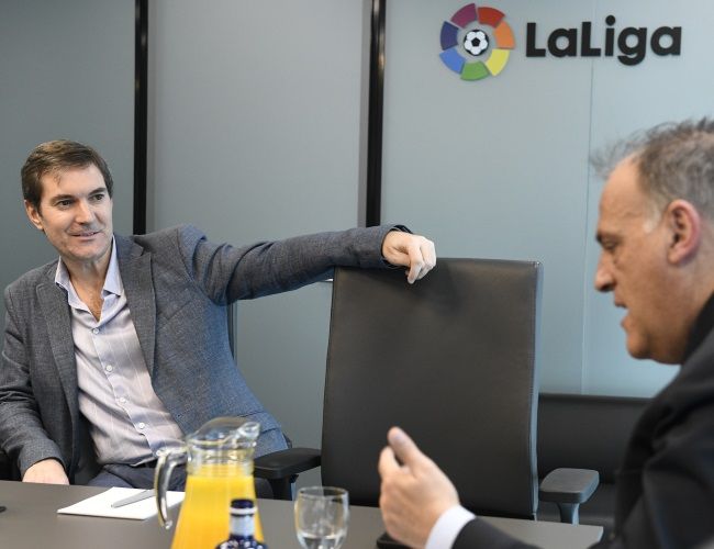 El presidente de la Superliga argentina, Mariano Elizondo, y su contraparte de LaLiga, Javier Tebas, se reunieron en la sede de esta última en Madrid para profundizar la cooperación entre ambas competiciones en el marco del MoU firmado por ambas partes en 2017.