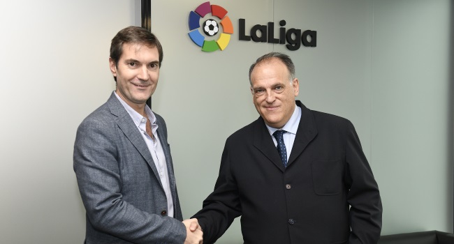 El presidente de la Superliga argentina, Mariano Elizondo, y su contraparte de LaLiga, Javier Tebas, se reunieron en la sede de esta última en Madrid para profundizar la cooperación entre ambas competiciones en el marco del MoU firmado por ambas partes en 2017.