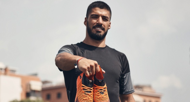 Suárez usará los botines PUMA FUTURE. El primer botín de fútbol con un ajuste verdaderamente personalizable, la tecnología NETFIT de PUMA Future permite a los jugadores adaptarse a sus necesidades únicas, sin importar la forma del pie o la necesidad de atado. La última versión disponible en el mercado es PUMA Future 2.1 (Uprising Pack) en un impactante color naranja.