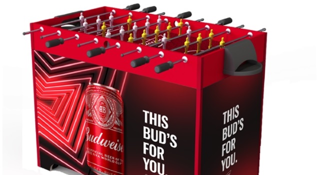 Con motivo de la Copa del Mundo, Budweiser volvió a sorprender a sus consumidores y presentó un producto único en el mercado pensado exclusivamente para los más fanáticos del deporte. Se trata de un frigobar (mini heladera) que se extiende y sostiene sobre su superficie un futbolito (futbolín) para que la gente pueda disfrutar del juego mientras toma una cerveza.