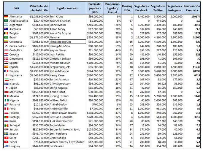 - No se tomó en cuenta los seguidores en redes sociales de un jugador específico, ya que los seguidores verían concurrentemente las camisetas nacionales y de sus clubes. Muchas veces difieren unas de otras. Ejemplo Messi usa en el Barcelona Nike, y Adidas en Argentina. Ronaldo usa en Real Madrid Adidas, y Nike con Portugal