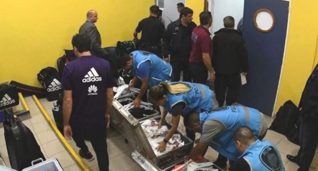 Todavía no había llegado el plantel “Millonario” a la cancha de Boca cuando unos hombres uniformados con la vestimenta y chalecos oficiales de la Polícia de la Ciudad de Buenos Aires, irrumpieron en el vestuario visitante para realizar una requisa. Mientras el cuerpo de la policía de la ciudad, con la ayuda de los de la Federal revisaban todos los elementos de la utilería, desde los cajones con la ropa de los jugadores hasta las heladeras con bebidas, los representantes de la CONMEBOL seguían bien de cerca los movimientos.