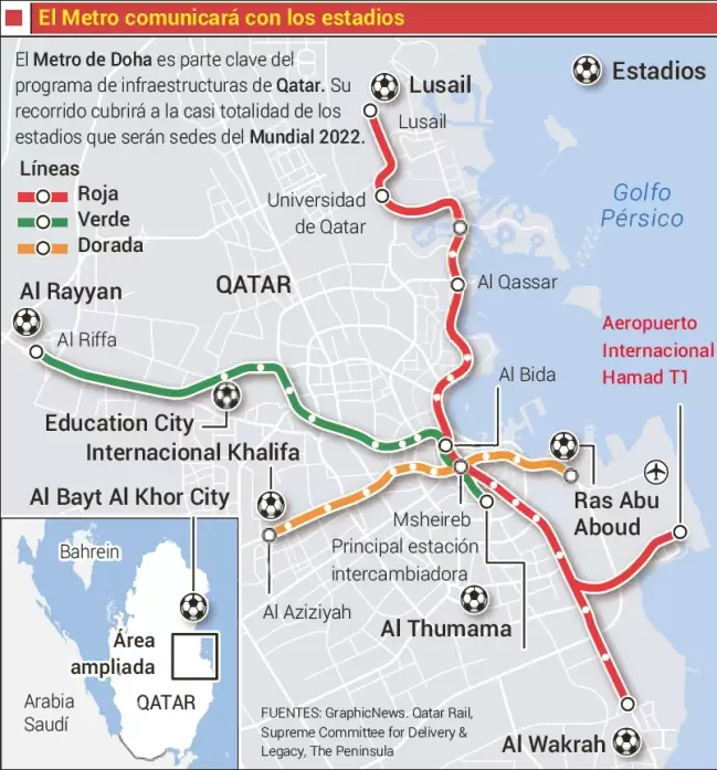 Además de sus lujosos asientos, estaciones de servicio y trenes de última generación sin conductor, el sistema conectará los principales estadios mundialistas a través de tres líneas de metro como son la verde, roja y dorada, en donde se encontrarán en el medio los escenarios deportivos de: Lusail, Khalifa, Ras Abu Aboud, Education City y Al Rayyan.
