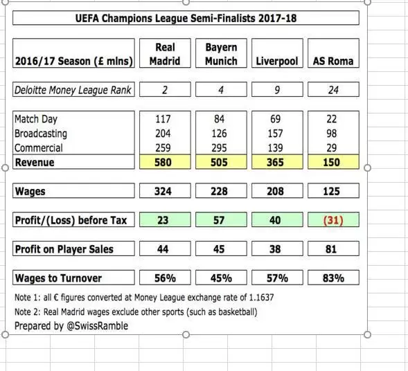 Siendo la AS Roma el equipo con el porcentaje de facturación más alto de entre los cuatro, es el Bayern Múnich el que menos dinero se llevaría en conceptos de recaudación, derechos de televisación y sponsors.