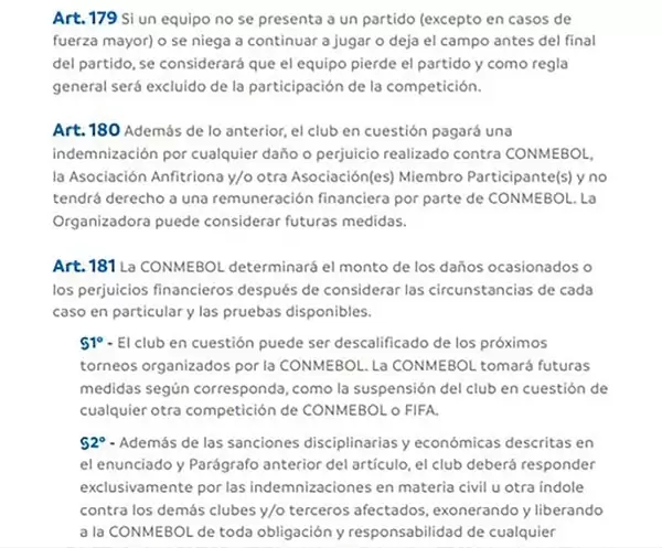 Además su artículo 180 explica que “además de lo anterior, el club en cuestión pagará una indemnización por cualquier daño o perjuicio realizado contra Conmebol, la Asociación anfitriona y/o otras Asociaciones Miembro participantes, y no tendrá derecho a una remuneración financiera por parte de Conmebol. La organización puede considerar futuras medidas”.