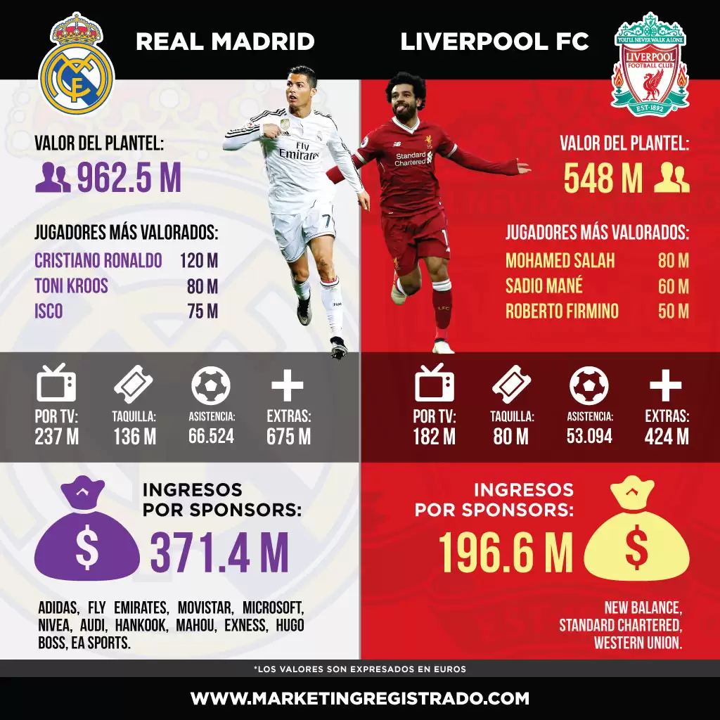 - Valor de mercado de su plantel: Real Madrid (962,5 millones); Liverpool (548 millones)*