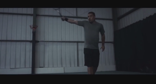 En una especie de duelo con un tenista enfrente, se ve al ex delantero perder un punto mientras se mide a su contrincante con la raqueta, motivo por el cual decide dejarla de lado y responder con los pies y con su cabeza.