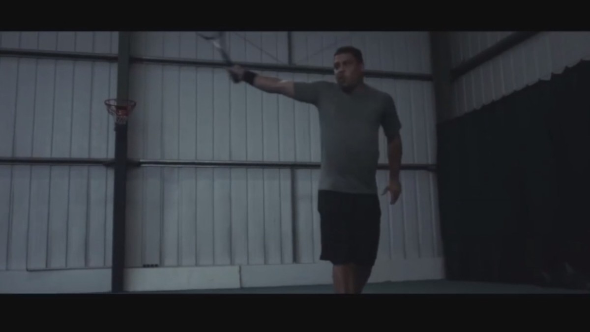 En una especie de duelo con un tenista enfrente, se ve al ex delantero perder un punto mientras se mide a su contrincante con la raqueta, motivo por el cual decide dejarla de lado y responder con los pies y con su cabeza.