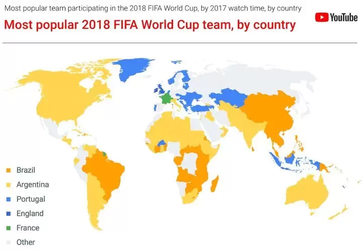 La clasificación se basó en los equipos más populares en cada país, de los que participan en la Copa del Mundo. El resultado se basa en el tiempo que se dedicó a ver videos de cada equipo en todos esos países y comenta, inclusive, que en algunos países no son las selecciones locales las favoritas. Ejemplo: Argentina es amplio favorito en países como Estados Unidos y Canadá, el norte de África, Australia, India, Medio Oriente e Italia.