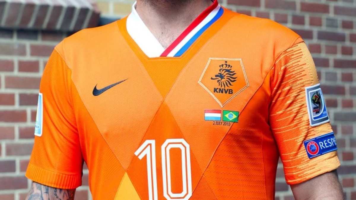 Sneijder recibió una camiseta compuesta por retazos de todas las que usó en la Selección