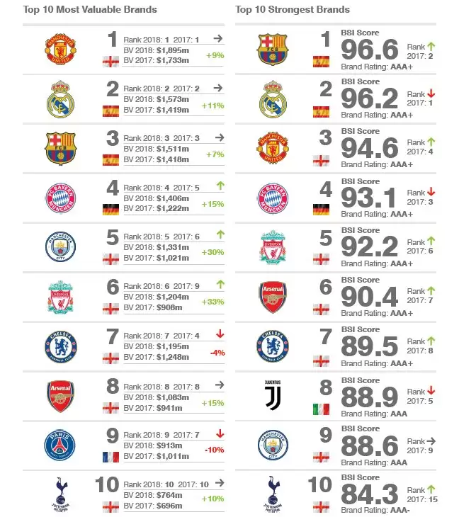 Sin presencia de ningún club no perteneciente a la UEFA, la clasificación reúne a varios de los clubes que han sabido invertir en posicionar y expandir sus respectivas marcas en mercados emergentes tales como el Manchester City, el Arsenal, el Tottenham, el PSG, el Liverpool y el Bayern Múnich, entre otros.