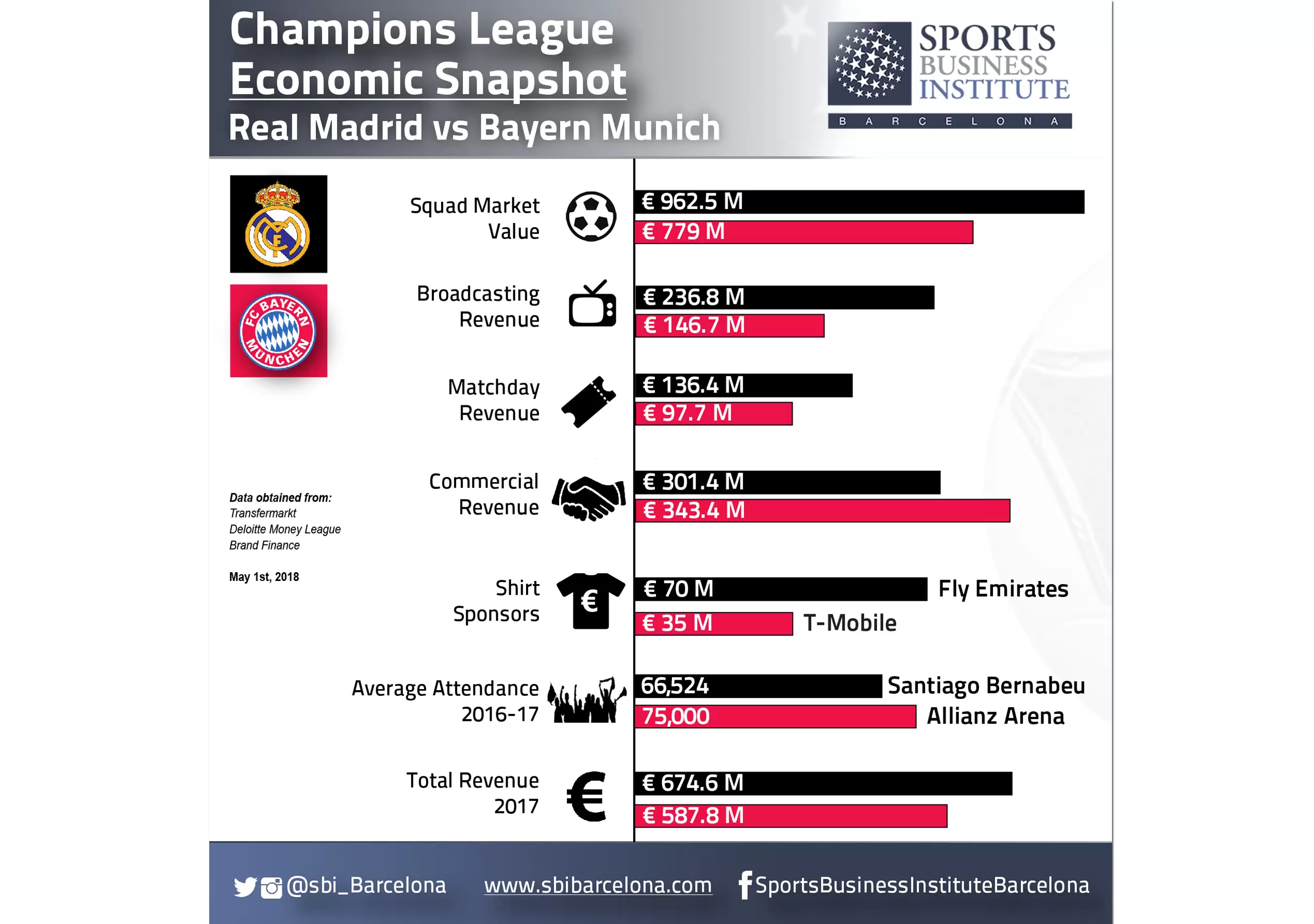 Entre otros, se analizó el valor de cotización de ambas escuadras, los ingresos por derechos de televisación, recaudación, acuerdos comerciales, patrocinadores en las camisetas y el promedio de asistencia por temporada, dejando al Real Madrid como el más favorecido de entre los cuatro.
