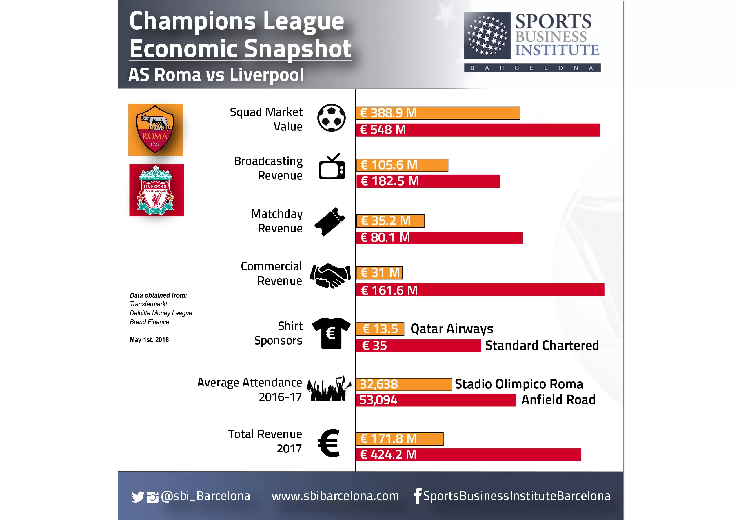 Del otro lado, el Liverpool se impuso con supremacía absoluta sobre la AS Roma, con un promedio que casi triplica lo ingresado por los romanos en la última temporada, siendo sus acuerdos comerciales el rubro en donde más ventaja fue sacada.