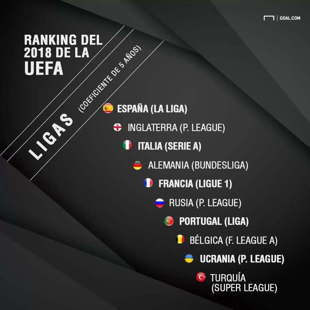 Tomando en consideración un coeficiente de los últimos 5 años, la UEFA presentó esta semana, en el cierre del 2018, su ranking de ligas locales con LaLiga de España en la cima de la lista, así como la presencia de las competencias: ucraniana, rusa, portuguesa, belga y turca.