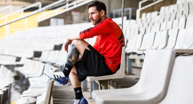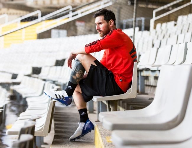 Lionel Messi encabeza este lanzamiento con sus nuevos botines adidas especialmente diseñados para él, combinando azul, blanco y negro y la insignia de Team Messi, su línea exclusiva de indumentaria de fútbol.