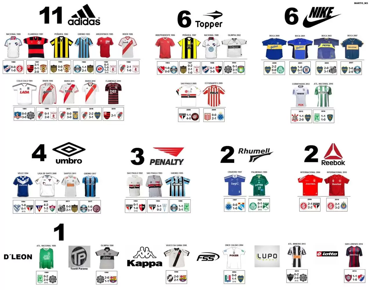 El segundo puesto es compartido por Topper y Nike, cada uno con seis títulos, mientras que el podio lo completa la marca Umbro con cuatro títulos. Penalty con tres, Rhumell y Reebok con dos y D’LEON, TP, Kappa, FSS, LUPO y Lotto completan la lista de las marcas que alguna vez han conseguido ganar una Libertadores.