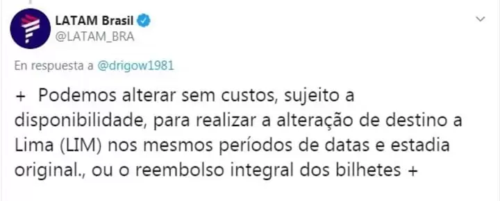 "Es imperioso que se devuelvan o aprovechen los gastos hechos en pasajes y hoteles. Felicito a LATAM por mantener una línea de ética y honestidad. Espero que todos sigan su ejemplo. ¡Rumbo a Lima!", agregó.