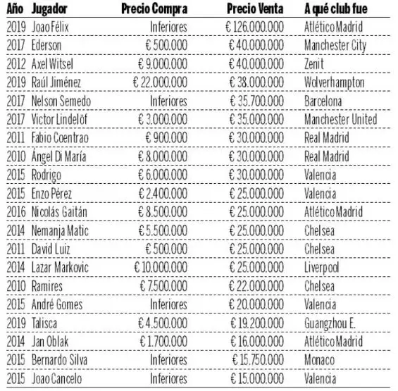 Algunos de los jugadores que el equipo supo vender bien, además de Joao Félix son: Nelson Semedo (al Barcelona por 35 millones), Bernardo Silva (al Mónaco por 15 millones), André Gomes (al Valencia por 20) y Joao Cancelo (por 15).