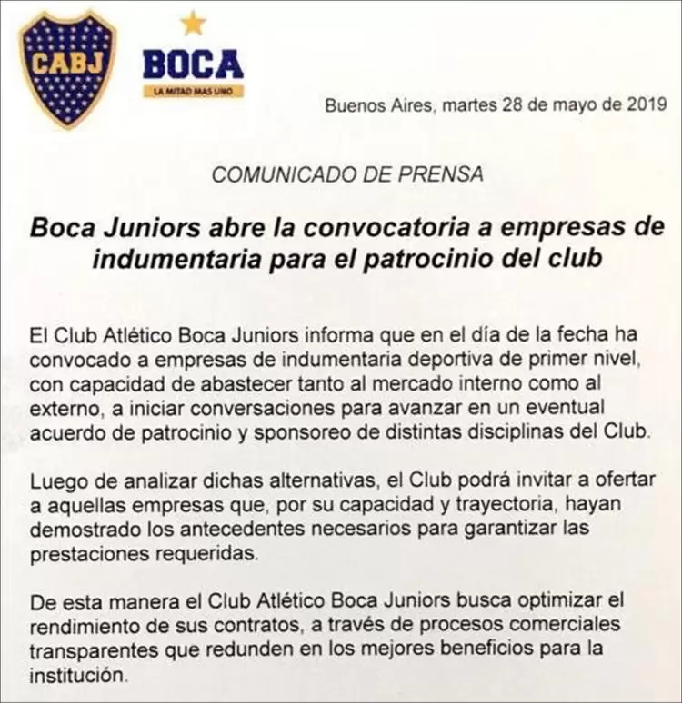 La licitación a empresas de "primer nivel" fue expresada de la siguiente manera: "Boca ha convocado a empresas de indumentaria deportiva con capacidad de abastecer tanto al mercado interno como al externo, a iniciar conversaciones para avanzar en un eventual acuerdo de patrocinio y sponsoreo de distintas disciplinas del club".