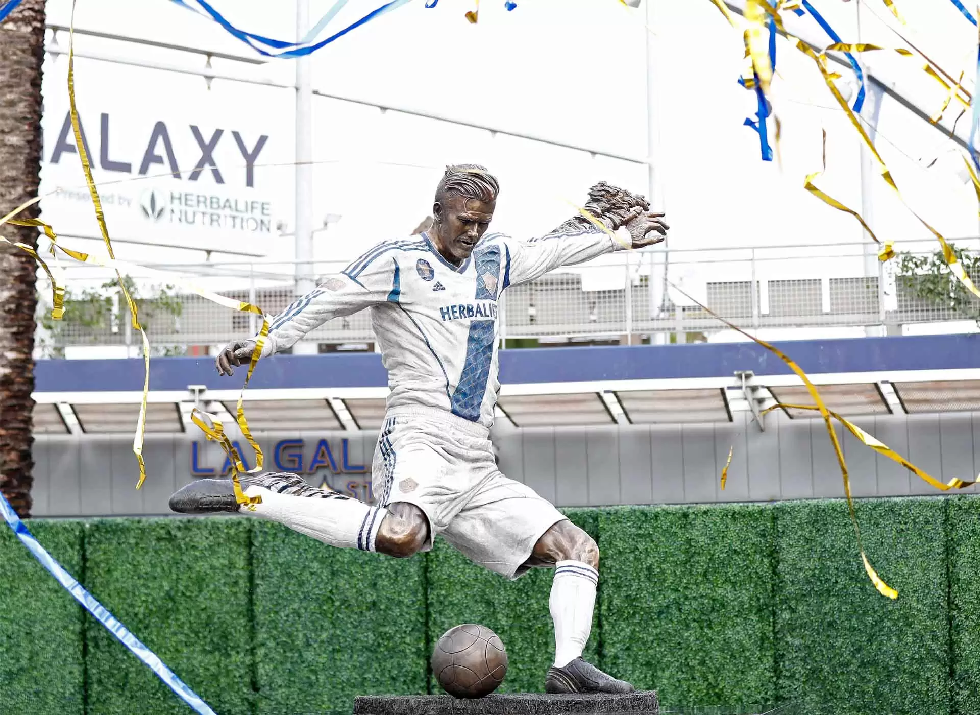 De la mano de cientos de actores, se montó un evento falso en donde un supuesto escultor presentó una estatua del mediocampista ex Manchester United, Real Madrid, PSG, LA Galaxy, entre otros, intencionalmente mal hecha.