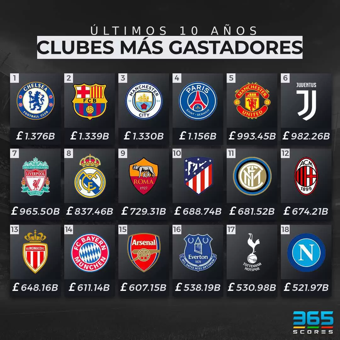 Demostrando un predominio absoluto del fútbol europeo, relevamos el trabajo de 365 Scores y repasamos cada uno de los clubes que encabezan una lista compuesta por las instituciones que más invirtieron en refuerzos en los últimos 10 años.