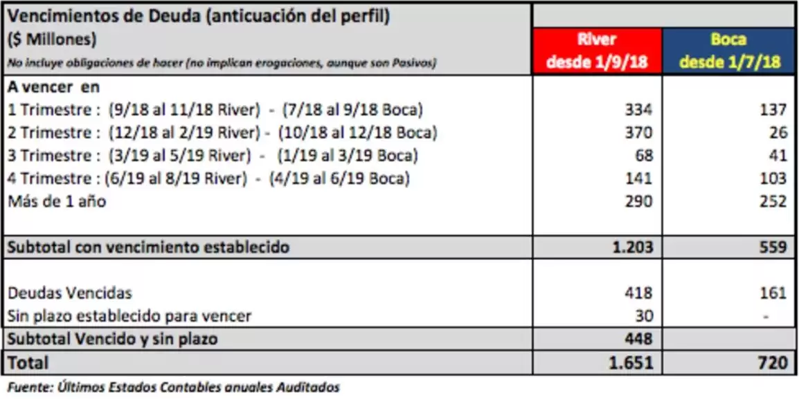 Otro dato que arrojó la comparación hecha por Daniel Rosamilia, contador público de la Universidad de Buenos Aires y especialista en Management y marketing deportivo, es que River tiene un perfil de vencimientos de deuda mucho más exigible a corto plazo y sendo revalúos Técnicos.