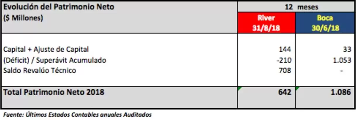 En cuanto a lo que tiene que ver con la devaluación, esta impactó más fuerte en los números de River, siendo la causa principal de su déficit, pese a que esto se vio compensado internamente con los saldos de los sucesivos Revalúos Técnicos sobre los activos inmovilizados, según explica Rosamilia. En contraposición, Boca muestra un superávit acumulado que sustenta su Patrimonio Neto.