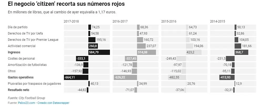 La última temporada no había nada buena para lo que respecta al City Football Group y (CFG) y sus números comerciales. El grupo económico que maneja al Manchester City y otros seis equipos del mundo, cerró la temporada 2017/2018 con unas pérdidas de 52,5 millones de euros, lo que representó un recorte interanual del 37%.