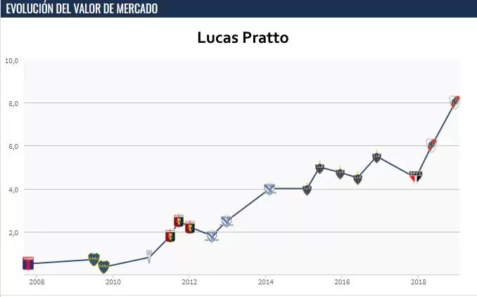 Luego de haber repasado la trayectoria de Pratto en cuanto a clubes, observemos cómo fue evolucionando el valor de mercado del jugador a lo largo de los años, según el sitio especializado Transfermarkt.
