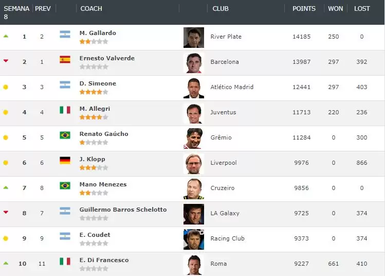 Si bien Santiago Solari se coronó campeón del Mundial de Clubes pasado, hace poco tiempo que está al frente del Real Madrid, por lo tanto sus puntos no son tantos todavía, incluso no aparece en el Top Ten. Pep Guardiola no está en los primeros puestos del ranking debido a la mala fase de grupos que tuvo el City en la Champions League.