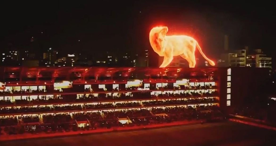 Se trata del león de fuego que apareció por una de las tribunas y recorrió el estadio caminando y asombrando a todos. Se trató de un montaje que dio la vuelta al mundo y que posicionó a la empresa Full Dimensional.