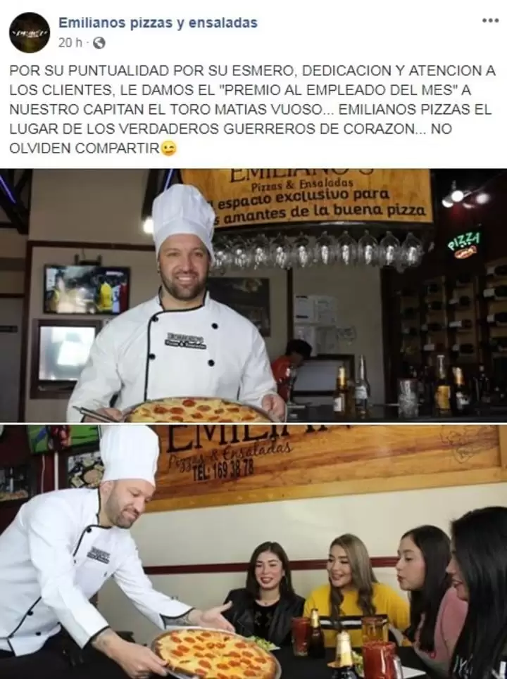 Bajo el nombre de “Emiliano pizzas y ensaladas”, Vuoso forma parte de un local que produce pizzas para todos los gustos en la ciudad de Monterrey y que a través de sus redes sociales ya lo felicitó por su “esmero, dedicación y atención a los clientes”.