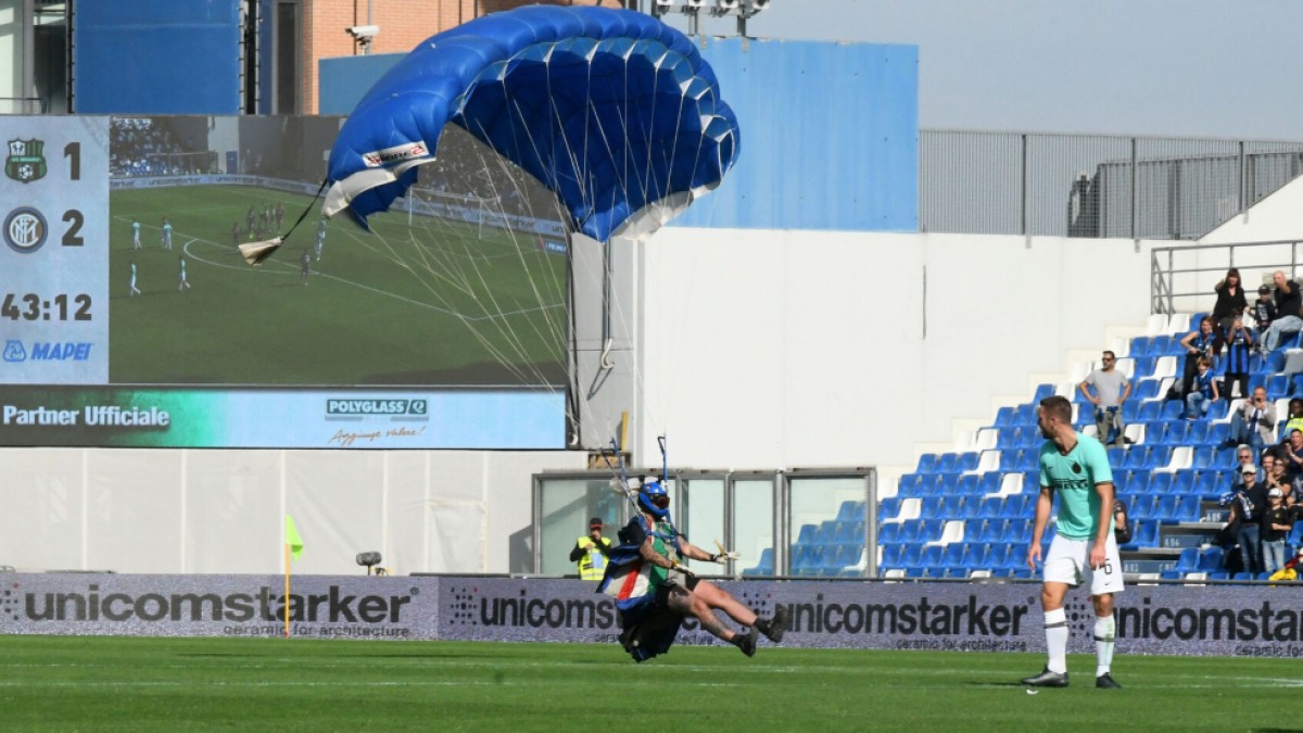 Un paracaidista aterrizó en la cancha e interrumpió el partido entre Inter y Sassuolo
