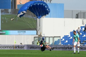 Cuando estaba por finalizar la primera parte y antes de que Romelu Lukaku marcara el tercer gol de penal, un paracaidista aterrizó la cancha. Más allá que la cámaras de televisión no mostraron imágenes de la escena, las redes sociales estallaron de videos de los hinchas que estaban en el estadio. Al instante los agentes de seguridad entraron al campo de juego y sacaron al hombre sin problemas.