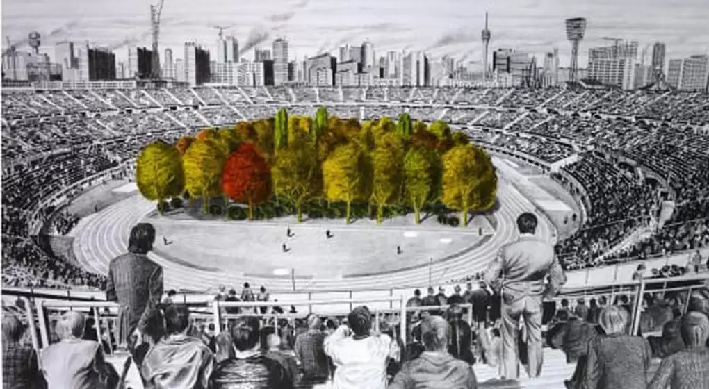 Convirtiendo en realidad una vieja ilustración del artista y arquitecto austríaco Max Peintner hace más de 30 años, Littmann plantó un bosque literalmente, en el campo de juego del estadio Wörthersee en Klagenfurt como un llamado de atención sobre el cambio climático y la deforestación en el mundo.