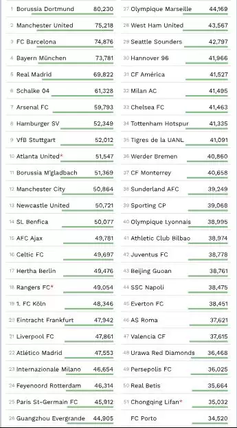 El mismo informe presentado por el Observatorio de fútbol CIES, también muestra cuál es el promedio de asistentes a los estadios de los equipos más importantes del mundo. El ranking lo lidera el Borussia Dortmund con una asistencia promedio de 80.230 espectadores.