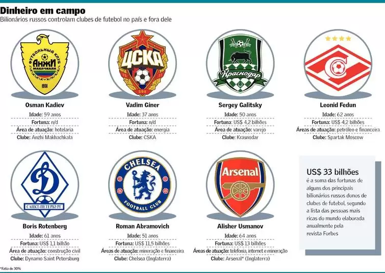 Dedicados a la telefonía, minería y otras industrias además de los clubes de fútbol, son Alisher Usmanov y Roman Abramobich, dos de los principales empresarios del medio y quienes a su vez administran al Arsenal y Chelsea respectivamente. Sus fortunas están calculadas en 13 y 11.5 billones de dólares.